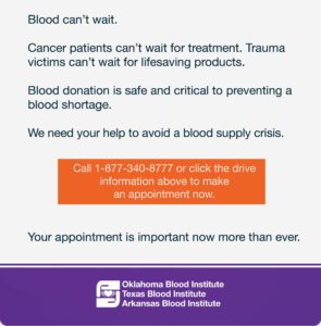 Please make donating at this blood drive a priority. Patients in Oklahoma hospitals are counting on your donation to survive.