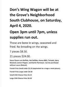 Wings and Beer Available at South Clubhouse Parking Lot Saturday, April 4th Posted on April 3, 2020 by Jenny Street All, please see below if you are interested in some wings and beer this Saturday: