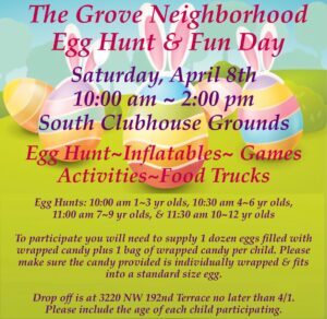 The Grove Egg Hunt and Fun Day April 8th Posted on March 22, 2023 by Jenny Street All, please see below for info on the Grove Egg Hunt and Fun Day.