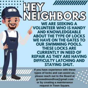 Attention Residents: Volunteer Needed for Pool Gate Lock Repair Your help in keeping our pool areas safe and secure is greatly appreciated! Posted on June 15, 2024 by Jenny Street